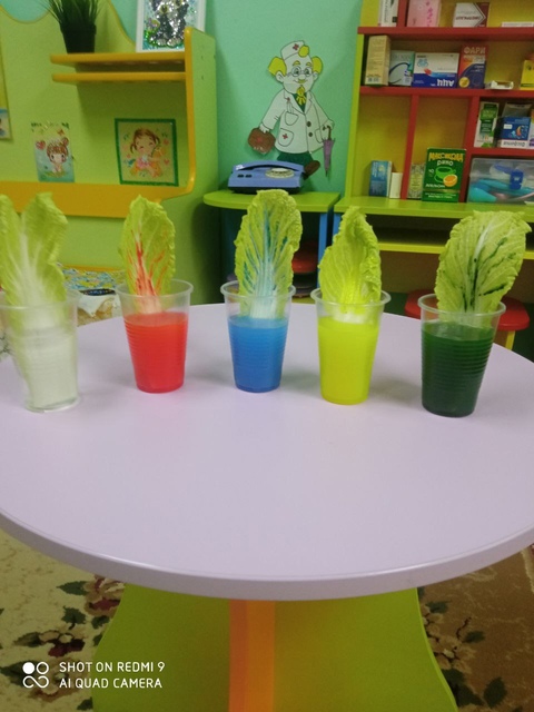 Так ребята средней группы вместе со своим воспитателем провели эксперимент с водой и листьями капусты, который доказал, что растения живые и они питаются.